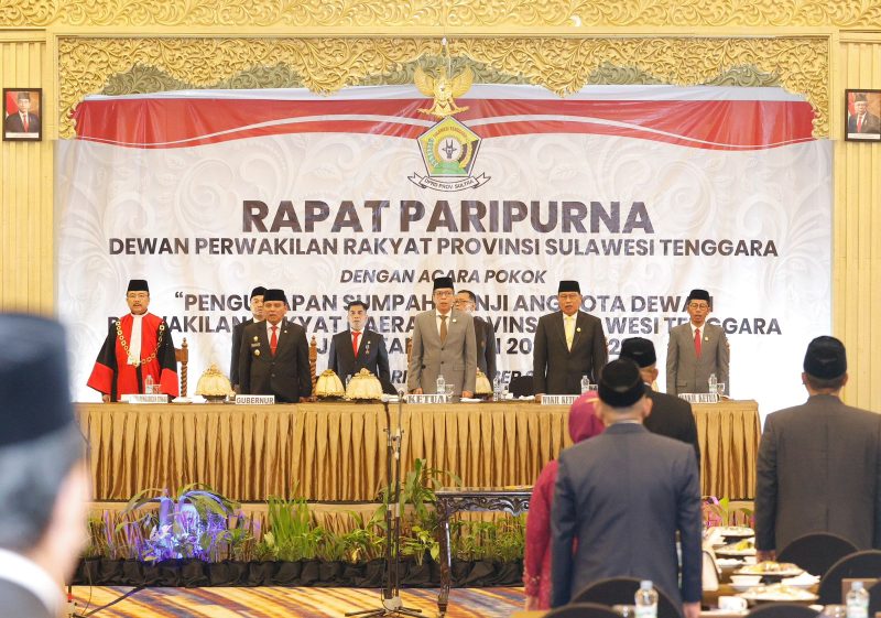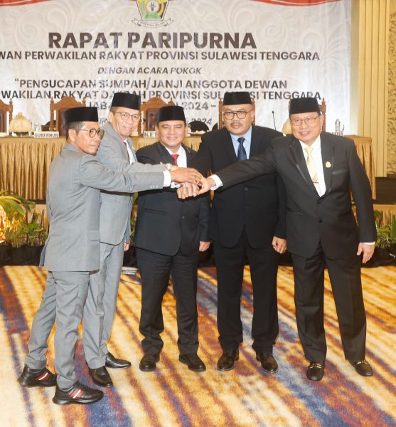 “Demi Allah, saya bersumpah bahwa saya akan memenuhi kewajiban saya sebagai anggota Dewan Perwakilan Rakyat Daerah Provinsi Sulawesi Tenggara sesuai dengan ketentuan perundang-undangan,” ucap serentak seluruh anggota DPRD Sultra terpilih.