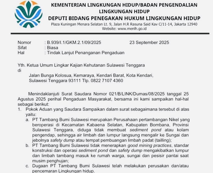 Surat tersebut berbunyi “Menindaklanjuti hasil Verifikasi Pengaduan berdasarkan Formulir Pengaduan Nomor Registrasi: 08/ADU-LH/DLHPROV.SULTRA/VIII/2025 tanggal 14 Agustus 2025 terkait Dugaan Adanya Pencemaran Air Sungai dan Air Laut Akibat Aktivitas Kegiatan Penambangan oleh PT. Tambang Bumi Sulawesi di Kabupaten Bombana Provinsi Sulawesi Tenggara pada tanggal 25 sampai 28 Agustus 2024 bersama ini disampaikan hal-hal sebagai berikut: