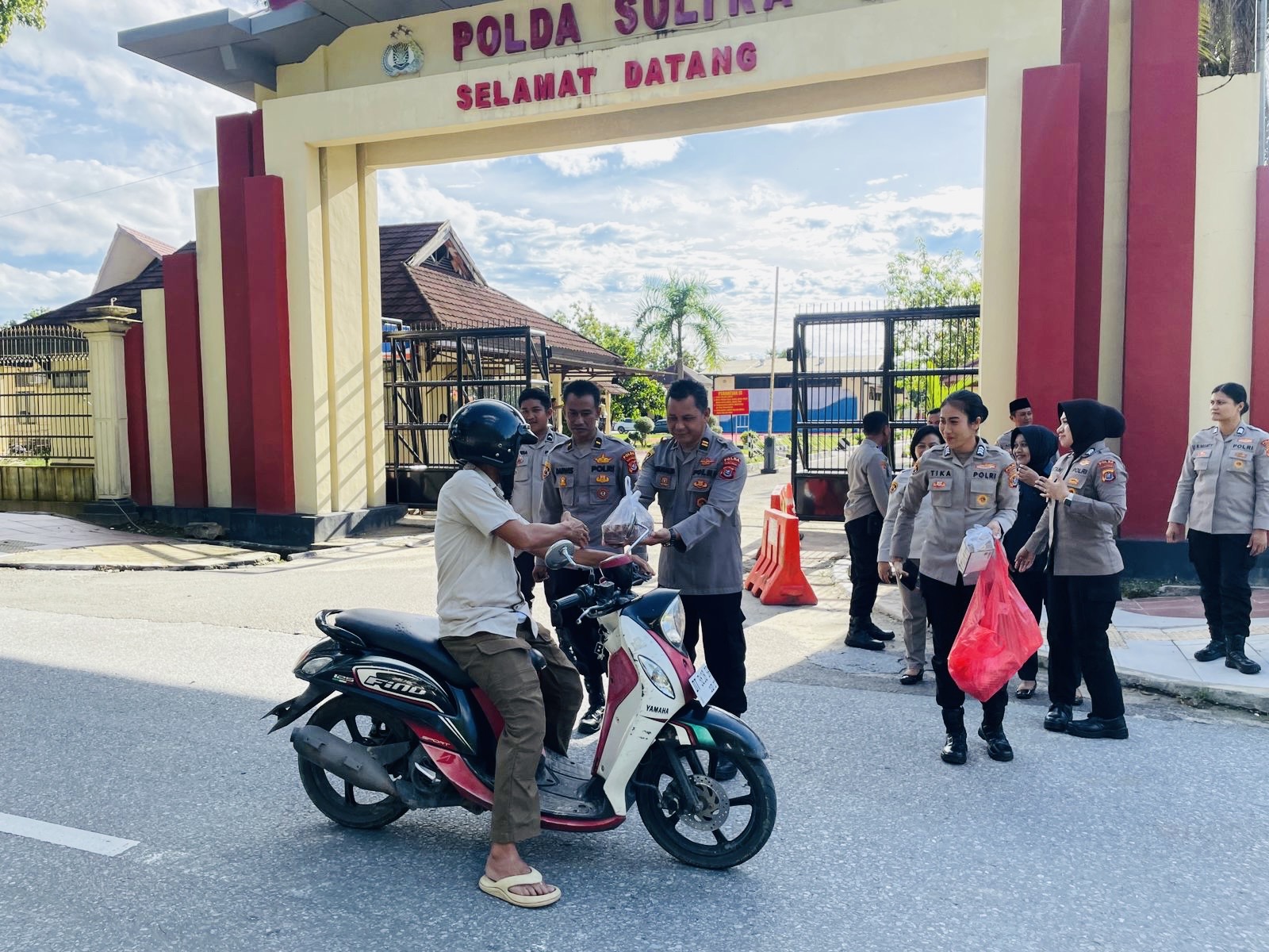 Di tengah arus lalu lintas dan aktivitas warga yang bersiap menyambut waktu berbuka puasa, jajaran Biro Logistik Polda Sultra turun langsung ke jalan membagikan ratusan paket takjil kepada masyarakat.