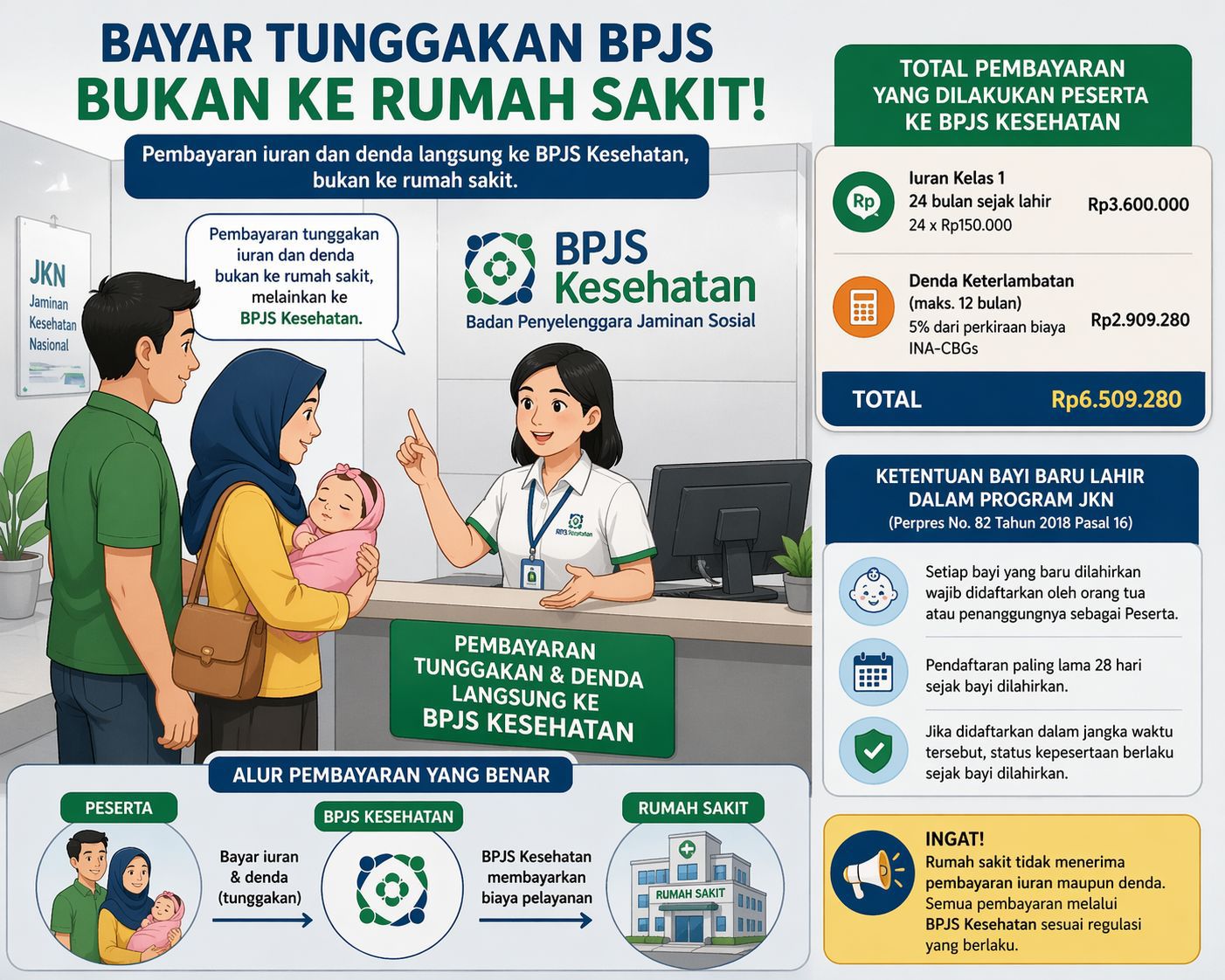 Ia juga membenarkan bahwa dalam kasus pasien bayi tersebut, pembayaran tunggakan dan denda dilakukan langsung ke BPJS Kesehatan. Hal ini sesuai dengan ketentuan dalam Peraturan Presiden Nomor 82 Tahun 2018.