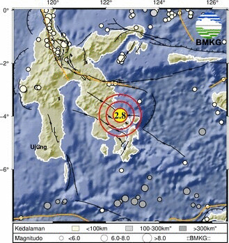 Episenter gempa berada pada koordinat 3,97 Lintang Selatan dan 122,53 Bujur Timur, atau sekitar 3 kilometer di timur Kota Kendari.