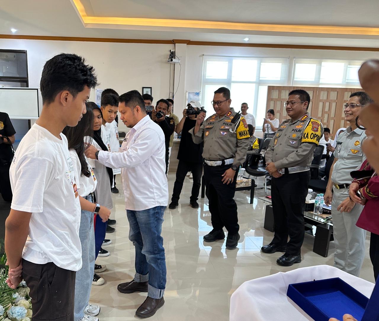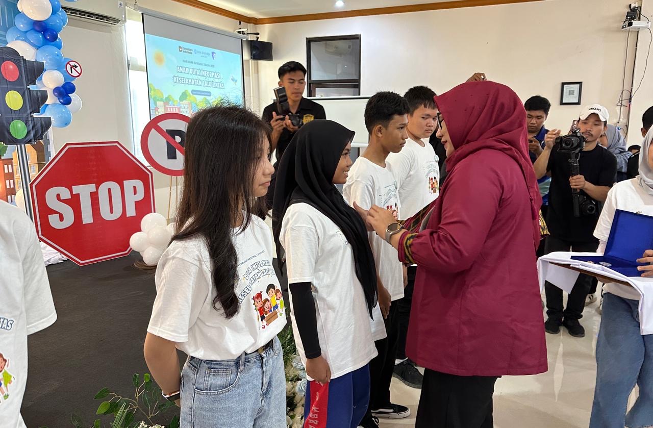Kadis PPPA Kota Kendari, Fitriani Sinapoy menyematkan pin keselamatan berlalu lintas kepada perwakilan pelajar di Kota Kendari.