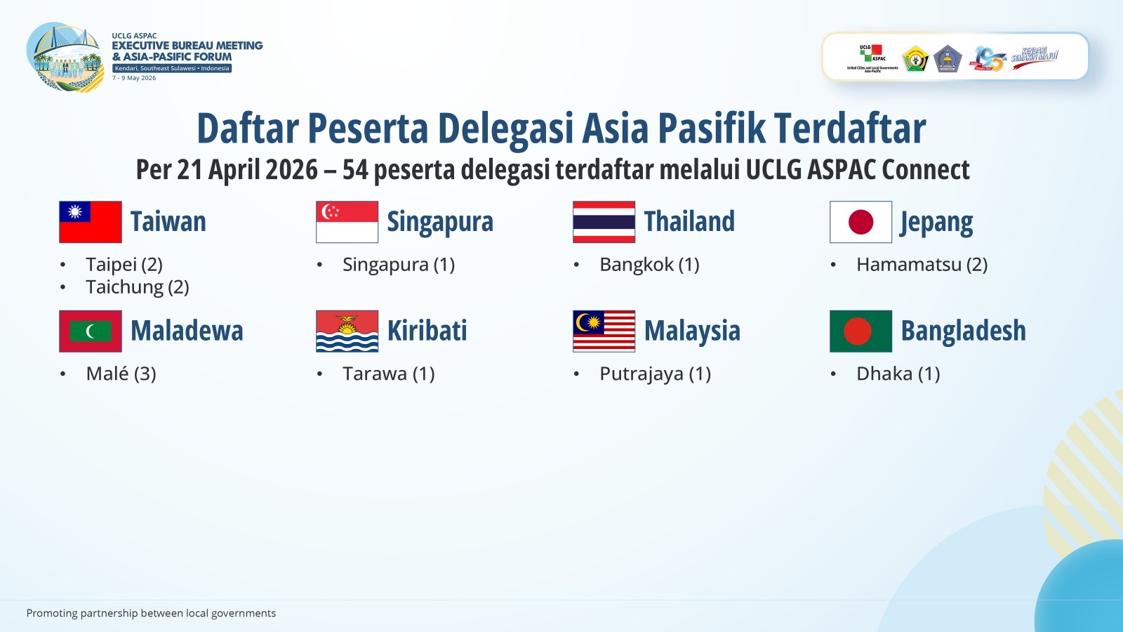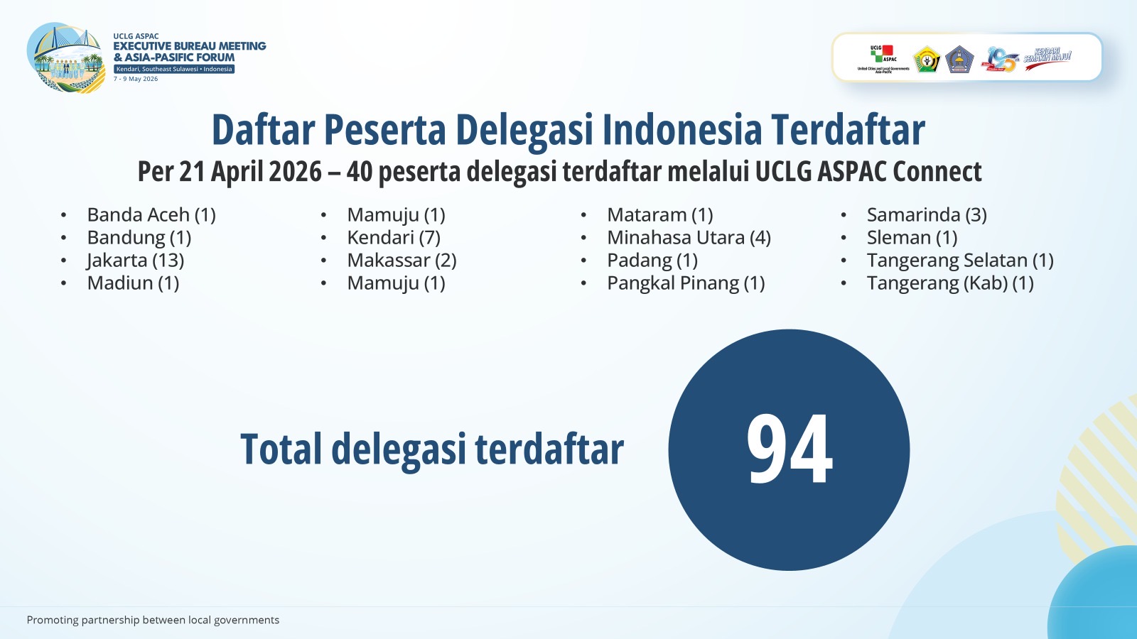 Berdasarkan data Sekretariat UCLG ASPAC Kota Kendari per 22 April 2026, jumlah peserta yang telah terdaftar mencapai 94 delegasi dari dalam dan luar negeri.