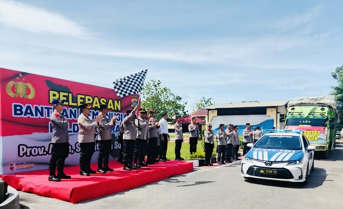 Kapolda Sultra, Irjen Pol Didik Agung Widjanarko melepas secara simbolis bantuan kemanusiaan kepada korban bencana alam di Pulau Sumatra. KENDARI – Kepolisian Daerah (Polda) Sulawesi Tenggara (Sultra) menunjukkan kepedulian dan solidaritasnya dengan mengirimkan bantuan kemanusiaan ke daerah-daerah di Pulau Sumatera yang terdampak bencana alam, yaitu Sumatera Barat (Sumbar), Sumatera Utara (Sumut), dan Aceh. Pelepasan bantuan ini dilaksanakan pada hari Senin, 1 Desember 2025, di Kendari.