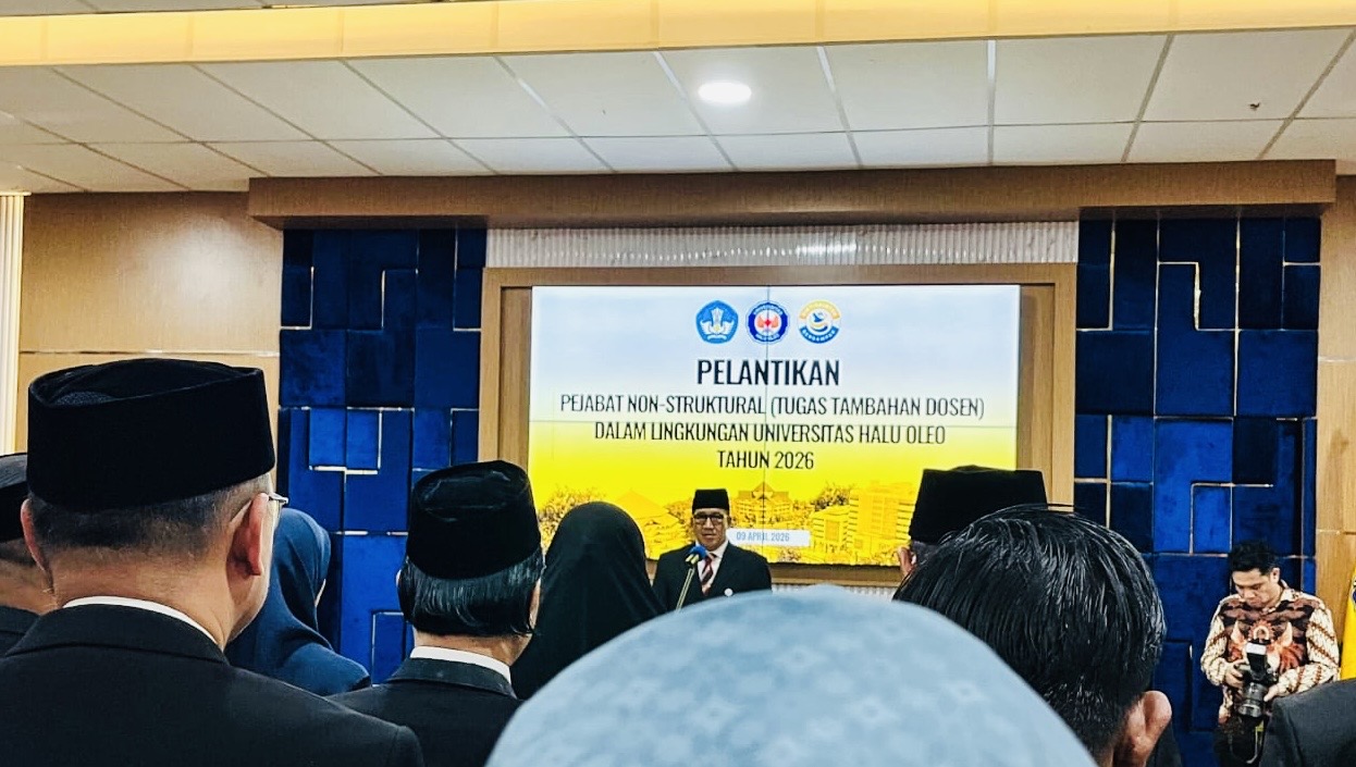 Pelantikan berlangsung di Gedung Rektorat UHO dan dihadiri jajaran pimpinan universitas, termasuk wakil rektor dan dekan.