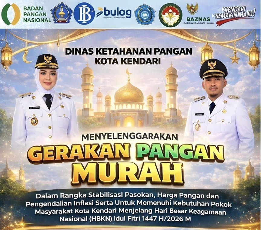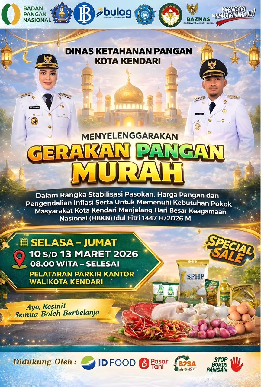 RADARKENDARI.ID – Pemerintah Kota Kendari melalui Dinas Ketahanan Pangan Kota Kendari akan menggelar Gerakan Pangan Murah (GPM) untuk membantu masyarakat mendapatkan kebutuhan pokok dengan harga terjangkau menjelang Hari Besar Keagamaan Nasional (HBKN) Idul Fitri 1447 Hijriah.