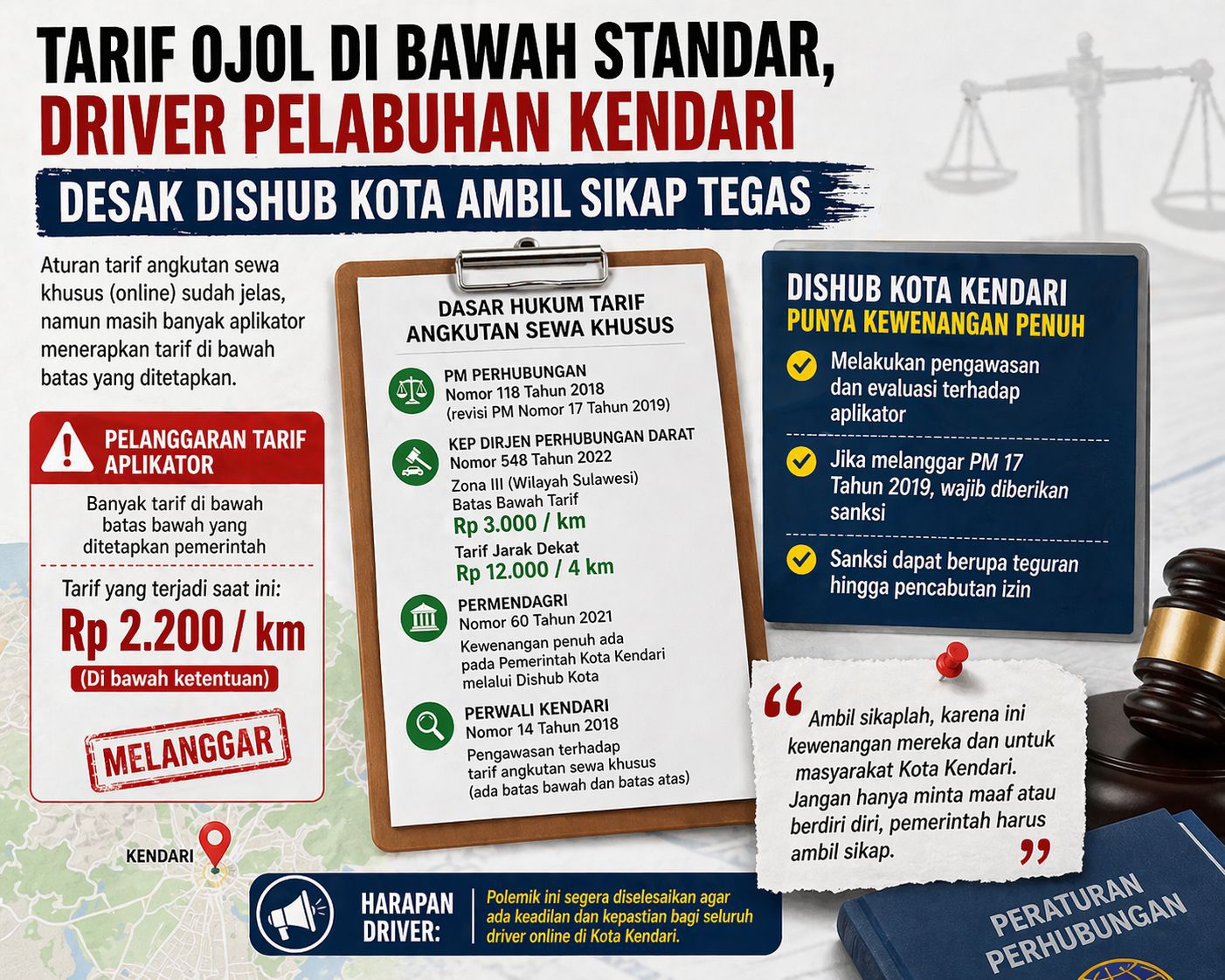 “Artinya, Dishub Kota Kendari punya kewenangan penuh untuk menyelesaikan polemik ini, termasuk melakukan pengawasan dan evaluasi terhadap aplikator,” tegasnya.